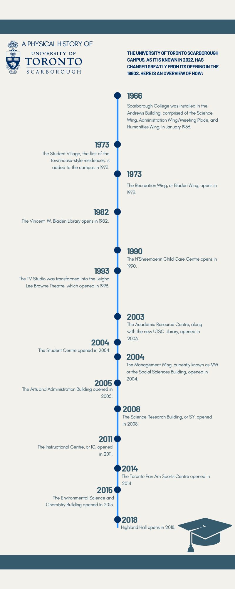 Below is a visualized timeline of the growth of the UTSC campus. To learn about the stories of how each segment came to be, use the navigation panel on the left.