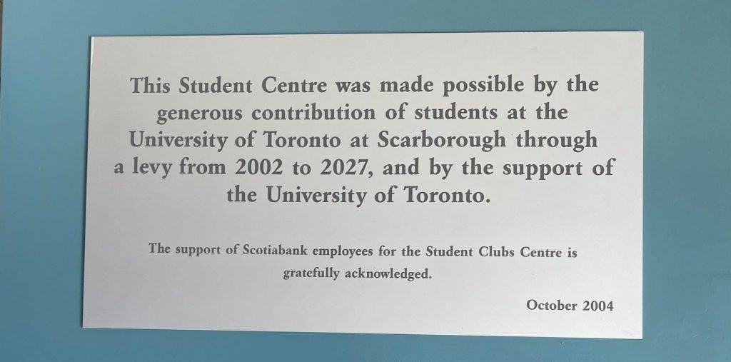 This photograph showcases a plaque on display in the Student Centre, commemorating the contribution of UTSC student to the building.